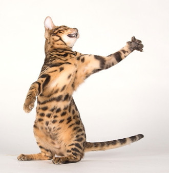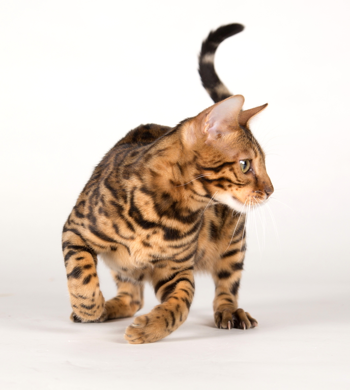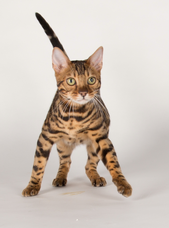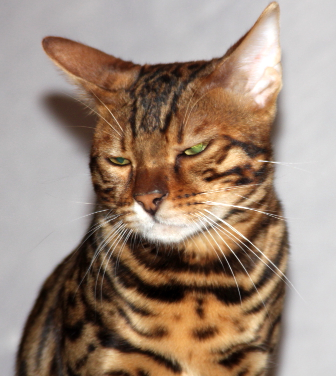 rund zu, wie bei einem Leoparden. Abgerundet wird das Bild einer perfekten Bengal durch einen sensationellen Kopf: grüne Augen, kleine, runde Ohren, ein gerades und langes